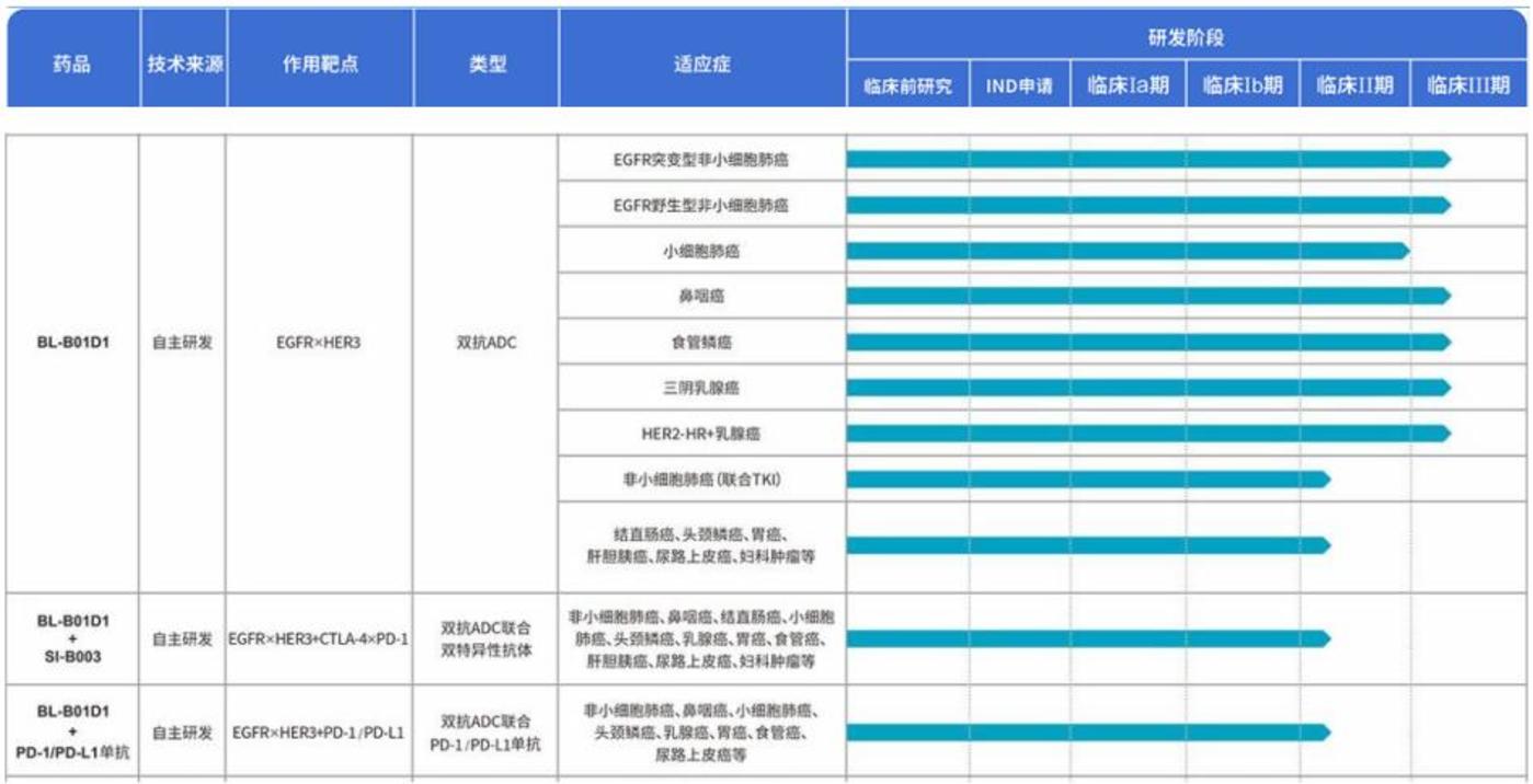 在双抗的赛道上,百利天恒不仅从双抗升级到多抗,且与ADC融合开发双抗ADC,在临床开发上,又进行双抗ADC(BL-B01D1)和双抗(SI-B003)用于多种癌症的临床试验,堪称最具备想象空间的选手。