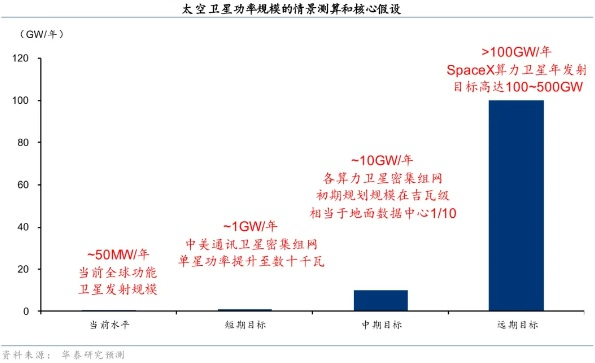华泰证券认为,传统通信、气象、导航、遥感卫星的需求规模在万颗、数十到百余颗、百余颗、数百到千余颗量级,单星功率在个位数到几十kW量级,整体拉动的卫星功耗至多在百兆瓦水平。