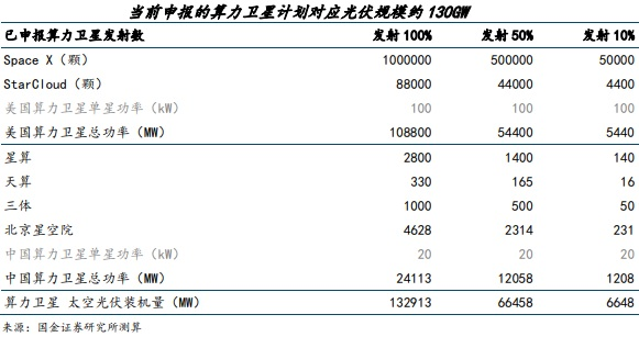 中远期来看,国金证券表示,算力卫星预计将为太空光伏带来超百GW需求量。ITU、FCC发射规则通常以发射量的10%、50%、100%为节点,根据中美已申报的卫星发射计划,美国以Space X和Starcloud为首的算力星座共计划发射108.8万颗算力卫星,卫星功率以Space X当前的设计规模100kW进行测算;中国以“星算”、“天算”、“三体”、“北京星空院”四大算力星座共计划发射8758颗卫星,考虑到国内芯片算力和功耗仍有一定差距,国内算力卫星假设以每颗卫星20kW功率测算,当发射量达到计划的10%/50%/100%时,对应太空光伏的需求量分别为6.6/66.5/132.9GW。