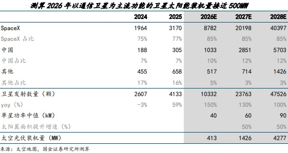 单星功率方面,考虑到理论计算得出的SpaceX V3卫星单星功率已达到57-76kW,国内也积极地向50-100kW级超大功率电源系统发展,假设2026-2028年全球卫星单星功率均值以太阳翼面积50%的扩大增速等比例提升,预计2026/2027/2028年太空光伏装机量分别为 413/1426/4277MW。