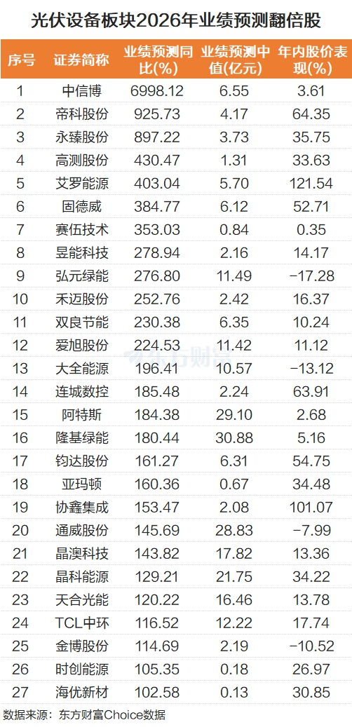 个股而言,不少机构预测光伏设备股有望在2026年迎来高增长。中信博机构预测2026年业绩预计同比增长6998.12%,归母净利润预测中值为6.55亿元。帝科股份预计业绩同比增长925.73%,归母净利润预测中值为4.17亿元。永臻股份、高测股份、艾罗能源等2026年业绩预测增幅也排名靠前。