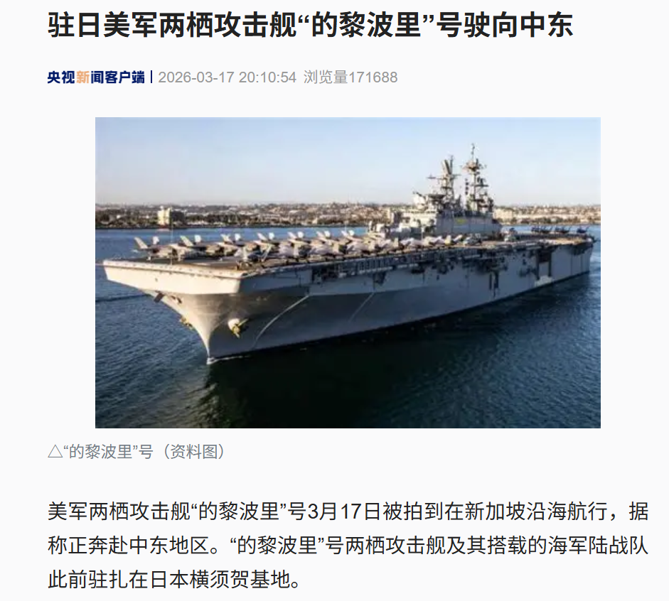 美军两栖攻击舰“的黎波里”号3月17日被拍到在新加坡沿海航行,据称正奔赴中东地区。“的黎波里”号两栖攻击舰及其搭载的海军陆战队此前驻扎在日本横须贺基地。