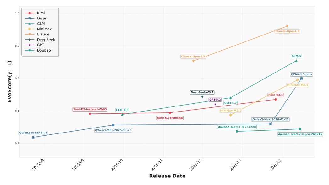 在所有参评大模型中,Claude Opus系列表现最为突出,从Claude-opus-4.5到Claude-opus-4.6,其EvoScore跃升至约0.9的高位,明显拉开了与所有竞争对手的差距。