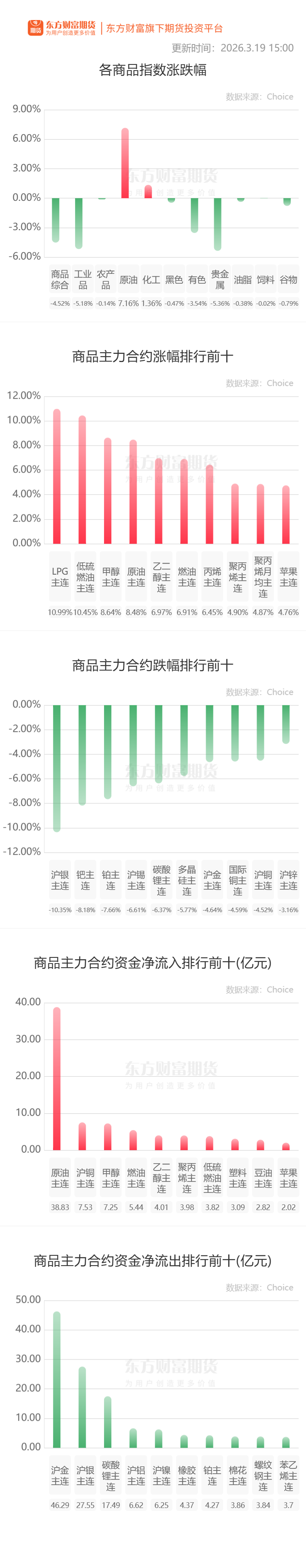 多晶硅:据数据显示,截至3月19日午间收盘,广期所多晶硅主力合约报收盘价38950元/吨,多晶硅合约价格跌破4万/吨大关。据SMM了解,此轮引发多晶硅价格下跌最开始原因其实主要源于下游。自春节后,硅片市场受后续市场预期以及企业间竞争影响,部分企业执行低价销售策略,价格迅速下跌,部分型号下跌幅度甚至来到20%-30%。(财联社)