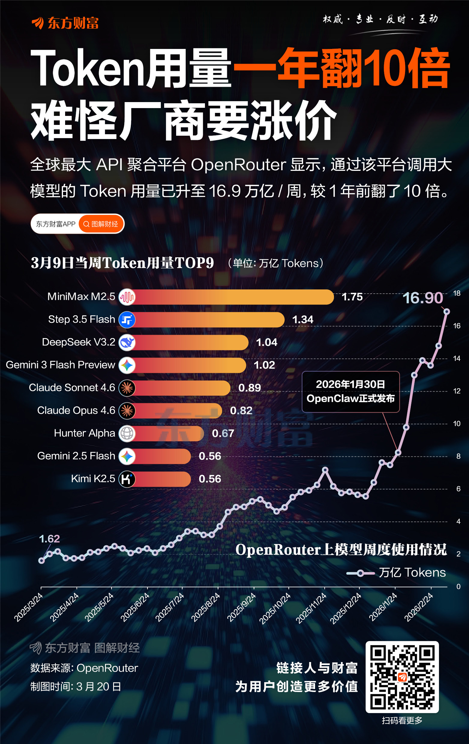 OpenRouter披露的数据显示,2025年3月24日当周通过该平台调用大模型所使用的Token量为1.62万亿,而到了今年,3月9日当周这一用量已涨至16.90万亿,一年时间翻了10倍。特别的,自今年1月30日OpenClaw(“龙虾”)正式发布,Token使用量涨速更加明显。OpenClaw发布当周该平台Token用量为8.25万亿,之后仅一个多月这一数量就翻倍至16.90万亿。