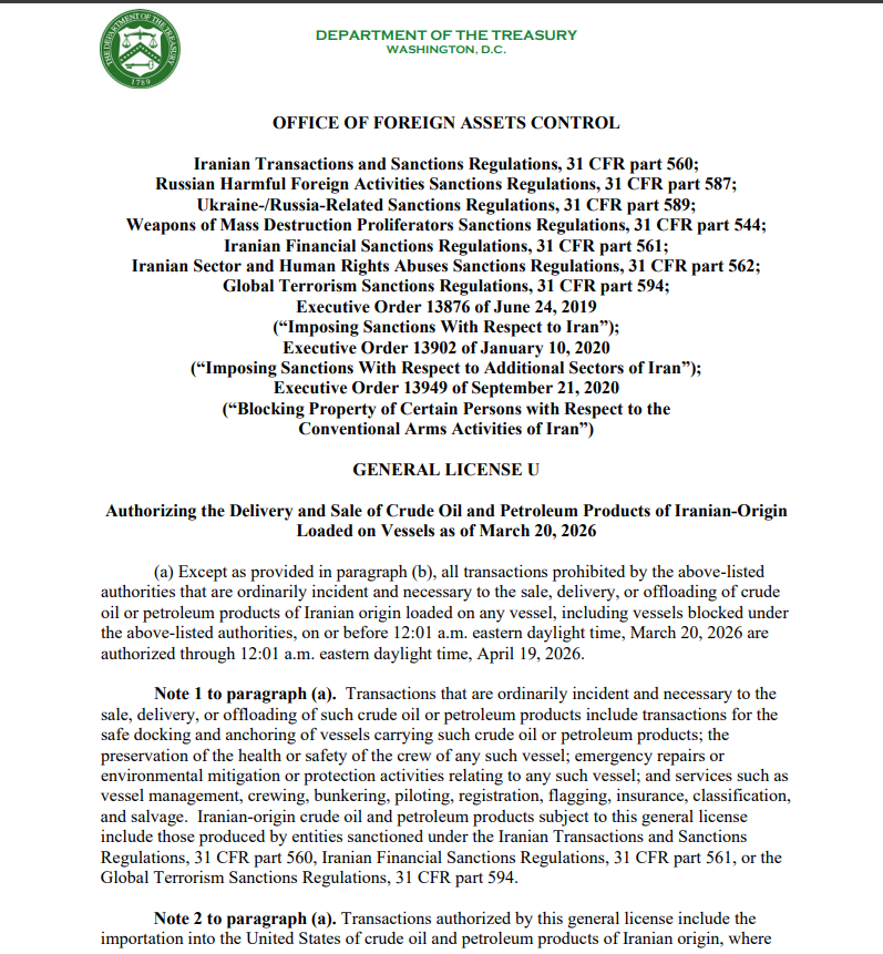 新许可允许出售截至3月20日已装载上船的伊朗原油及石油产品。该许可证已发布在美国财政部网站上。