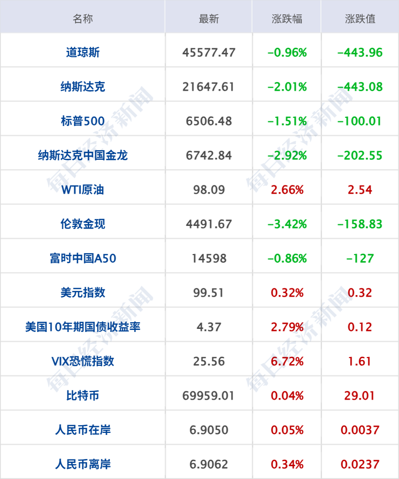 美股三大指数集体收跌,道指跌0.96%,本周累跌2.11%,连续四周下跌,创下自2023年2月以来最长的周线连跌纪录;纳指跌2.01%,本周累跌2.07%,连续四周下跌;标普500指数跌1.51%,本周累跌1.9%,连续四周下跌,创下自2025年3月以来最长的周线连跌纪录;超微电脑跌超33%,存储概念股集体下挫,闪迪跌超8%,西部数据跌超7%,希捷科技跌超5%,美光科技跌超4%。中概股普遍下跌,纳斯达克中国金龙指数跌2.92%,金山云跌超9%,小鹏汽车跌逾8%,蔚来跌超7%。