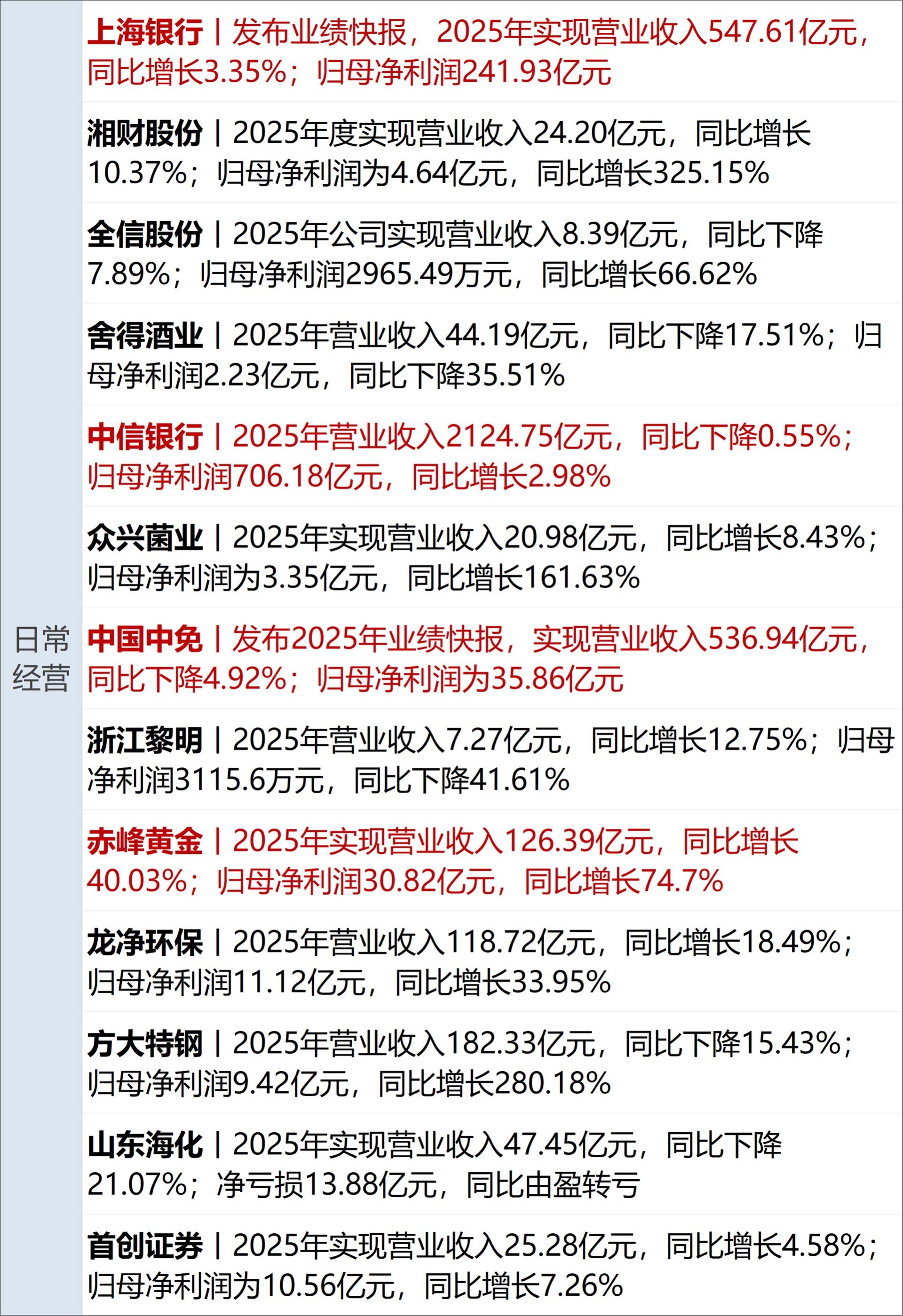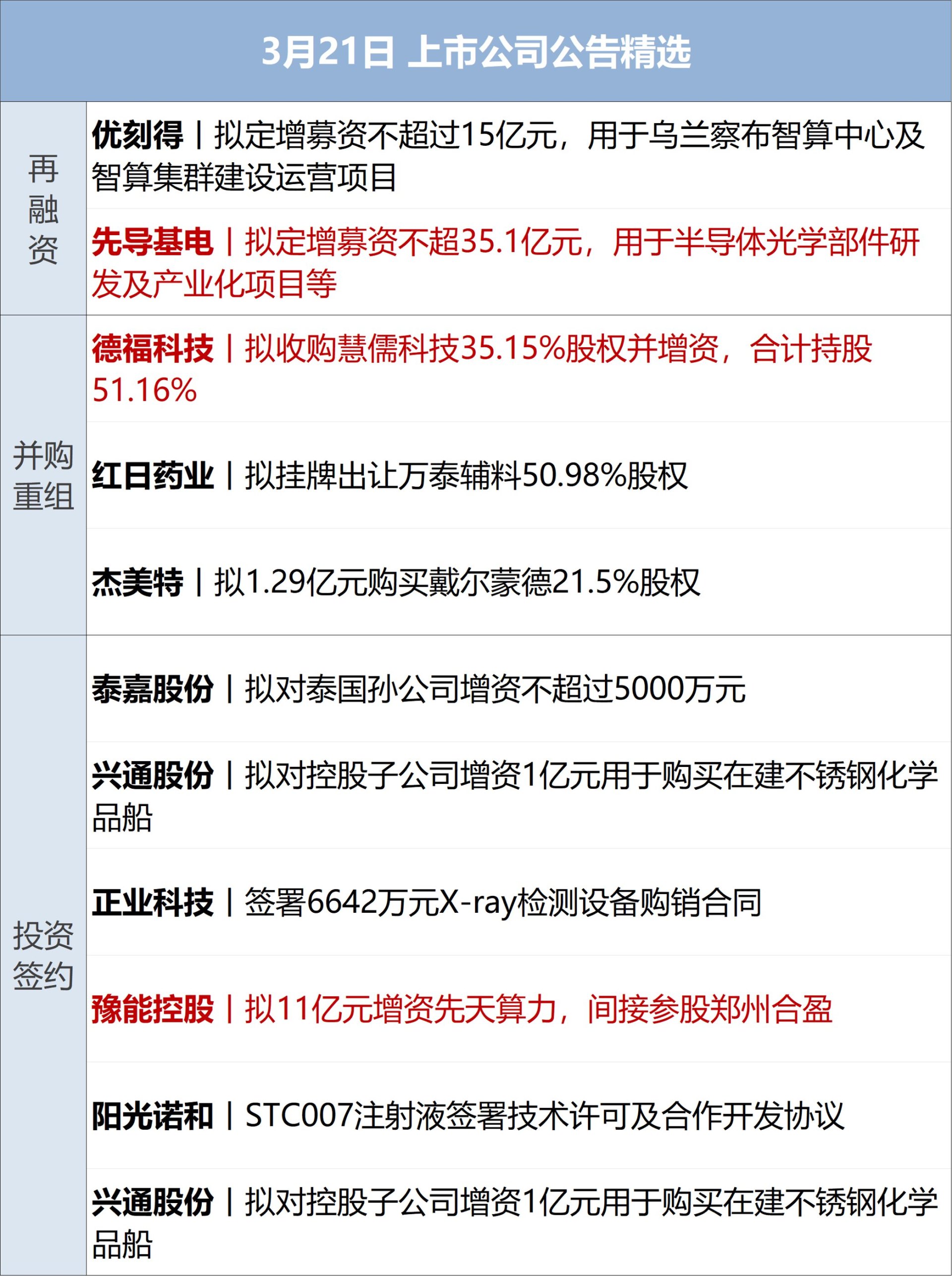 潜能恒信(SZ300191,股价38.78元,市值124.10亿元):3月19日,潜能恒信发布公告称,公司董事会于近日收到威海市文登区监察委员会《留置通知书》和《立案通知书》,公司副总经理张卉被立案调查并实施留置措施。经初步了解,本次立案调查系张卉原单位的个人事项,与公司无关,不会对公司的日常运营造成重大影响,公司各项生产经营活动正常有序进行。据公司2024年年报显示,张卉,1978年生,本科学历,2012年9月加入潜能恒信,兼任智慧石油副总经理兼联管会秘书。张卉当年税前年薪为72.24万元。