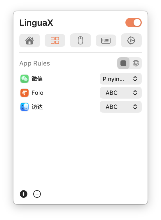 最初做这个是因为受不了频繁切输入法,做了个按应用自动切换输入法的工具。后来发现自己用罗技鼠标的体验也很糟糕 —— Logi Options+ 又大又卡,Mac Mouse Fix 不支持罗技特殊键,于是就顺手把鼠标增强也做进来了。