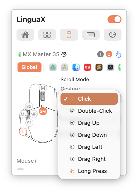 - 支持鼠标按键映射到快捷键、系统操作、打开应用/URL、运行 AppleScript