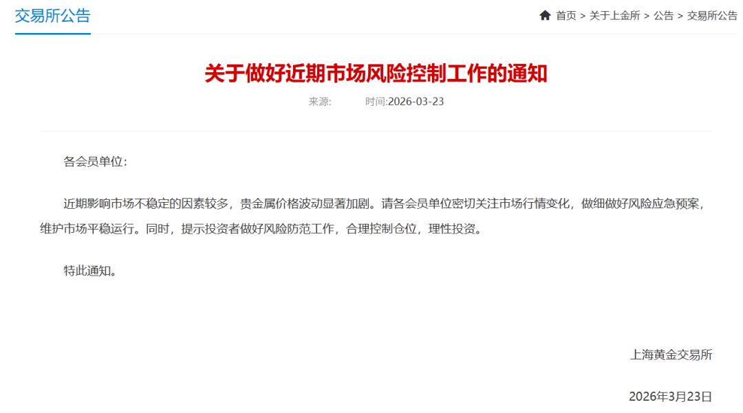 Home股票上金所最新通知 股票 2026 年 3 月 23 日 上金所最新通知 By 每日经济新闻 - Advertisement - 每经编辑|张锦河 向江林 3月23日,上金所发布通知,近期影响市场不稳定的因素较多,贵金属价格波动显著加剧。请各会员单位密切关注市场行情变化,做细做好风险应急预案,维护市场平稳运行。同时,提示投资者做好风险防范工作,合理控制仓位,理性投资。 3月23日,现货黄金一度向下跌破4350美元,现报4387.520美元/盎司,日内跌3.54%。 编辑|张锦河 向江林 校对|金冥羽 每日经济新闻综合自公开信息 文章转载自 每经网 - Advertisement - Must Read 24小时 十大机构论市:骤雨过后终将迎来天晴 继续牛市上行趋势 古方信息网 - 2026 年 4 月 7 日 - Advertisement - 基金 今年以来新发“10亿基”突破百只 2026 年 4 月 7 日 外汇 竞争对手即将登陆华尔街 美光“独苗红利”或遭挑战 2026 年 4 月 7 日 贵金属 美元指数下跌带动黄金、白银价格上涨 2026 年 4 月 7 日 Related News 24小时 十大机构论市:骤雨过后终将迎来天晴 继续牛市上行趋势 2026 年 4 月 7 日 基金 今年以来新发“10亿基”突破百只 2026 年 4 月 7 日 外汇 竞争对手即将登陆华尔街 美光“独苗红利”或遭挑战 2026 年 4 月 7 日 贵金属 美元指数下跌带动黄金、白银价格上涨 2026 年 4 月 7 日 股票 日韩股市集体收涨,日经225指数涨0.55%,韩国KOSPI指数涨1.36%丨日韩股市 2026 年 4 月 7 日 - Advertisement -
