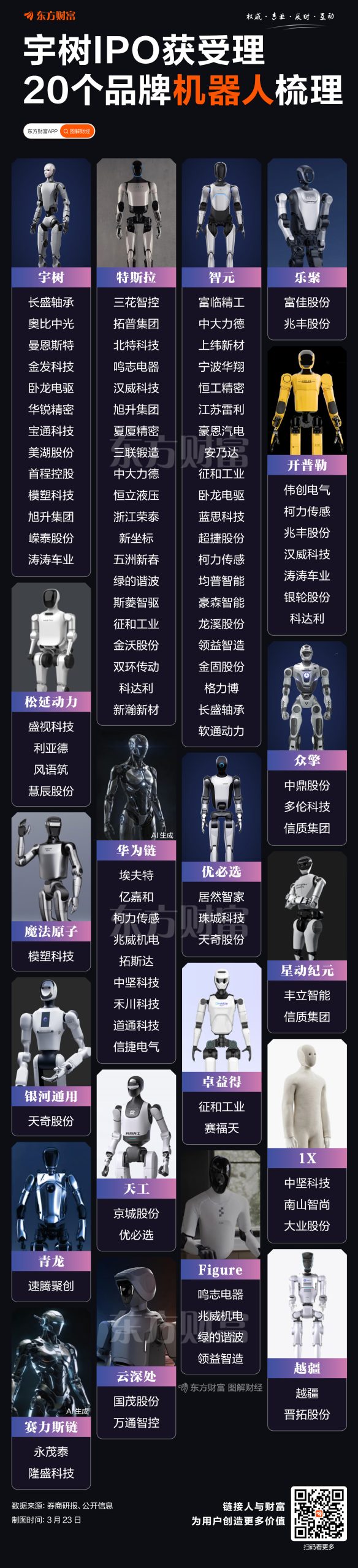 综合券商研报来看,特斯拉链(三花智控、拓普集团、鸣志电器等);宇树链(长盛轴承、卧龙电驱、金发科技等);Figure链(兆威机电、绿的谐波、领益智造等);1X链(中坚科技、南山智尚、大业股份等);智元链(中大力德、上纬新材、柯力传感等)较受市场关注。