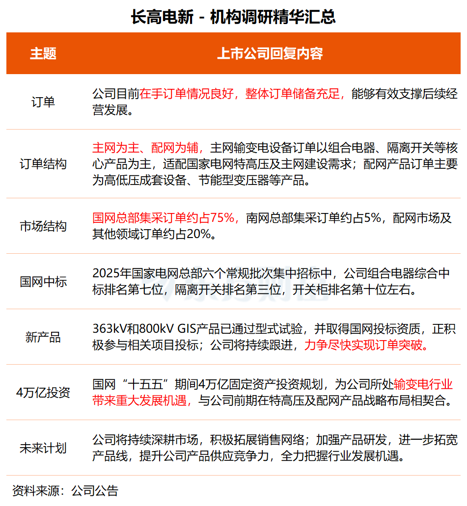 据长高电新透露,公司363kV和800kV GIS产品已顺利通过型式试验,并成功取得国家电网投标资质,目前正积极参与相关项目投标,推进市场拓展工作。订单落地时间主要取决于具体项目中标情况,公司将持续跟进,力争尽快实现订单突破。