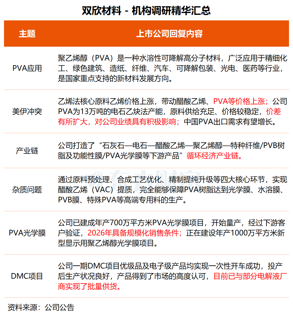 华金证券此前研报指出,双欣材料是国内聚乙烯醇行业三大龙头之一,公司重视定制化、高附加值聚乙烯醇产品的研发及生产,部分特殊型号聚乙烯醇产品已应用于钞票纸、电子玻纤、PVB功能性膜、水溶膜等高附加值领域;另一方面,公司持续攻关下游高端产品,部分新产品已取得突破性进展。