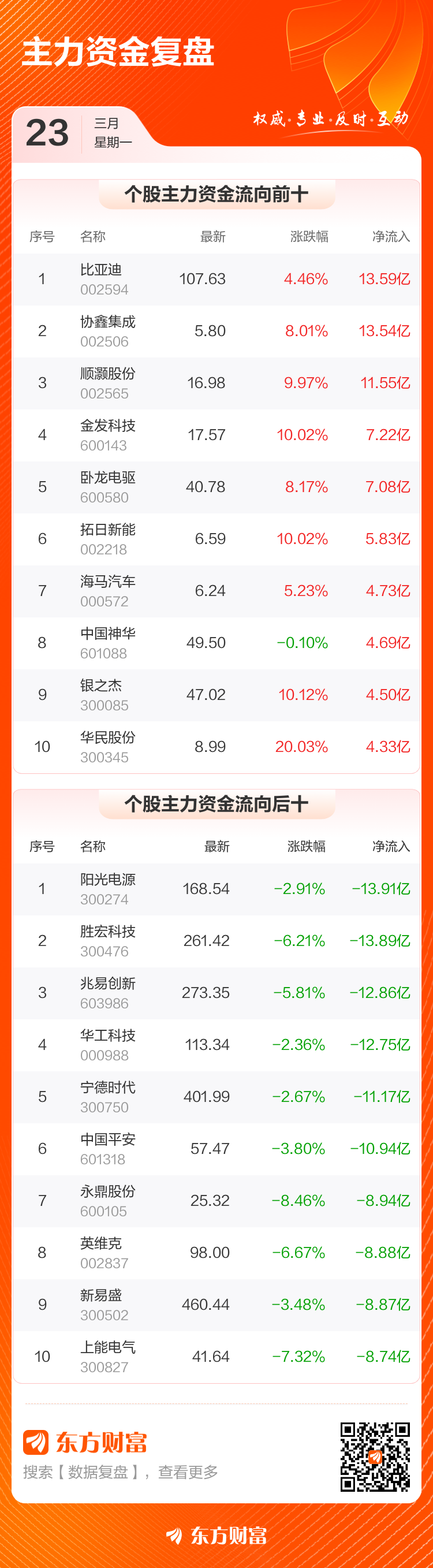 3月23日,沪指跌3.63%,深成指跌3.76%,创业板指跌3.49%。两市成交额2.43万亿,较上个交易日放量1447亿。数据显示,今日大盘主力资金净流出1253.99亿。乘用车、煤炭开采、电机Ⅱ等板块主力资金流入排名居前,其中乘用车净流入15.19亿元。