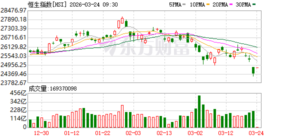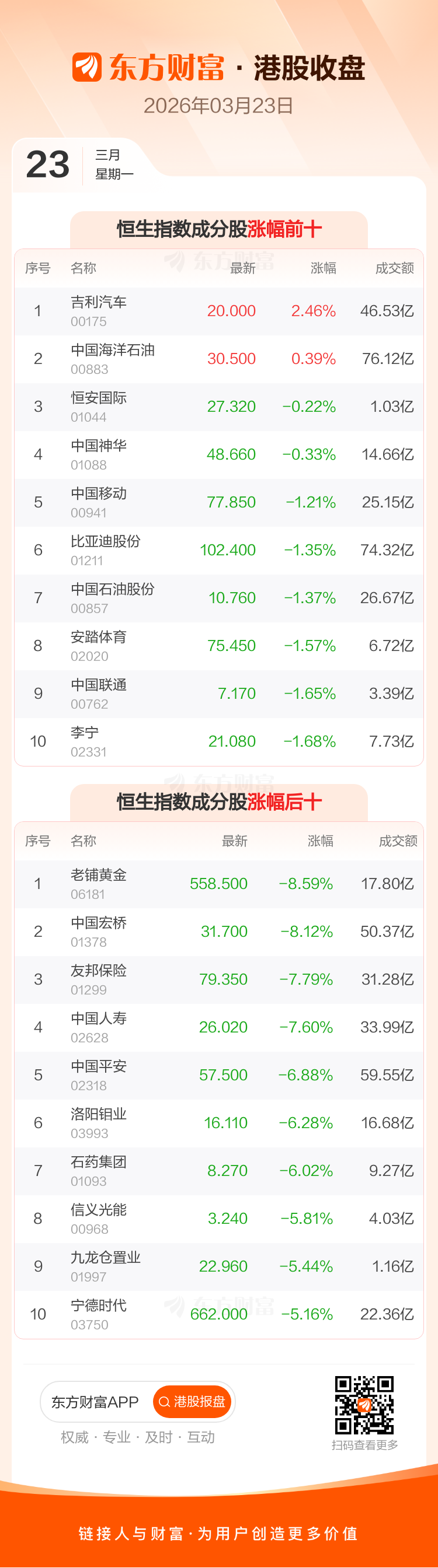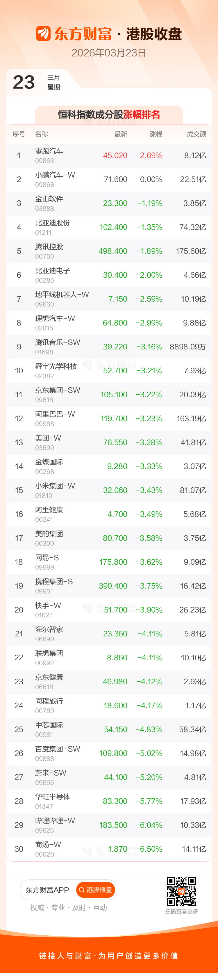 港股3月23日收盘走低,恒生指数收报24382.47点,跌894.85点,跌幅3.54%;恒生科技指数收报4712.48点,跌159.9点,跌幅3.28%。恒生指数成分股中吉利汽车、中国海洋石油涨幅居前,老铺黄金、中国宏桥、友邦保险跌幅靠前。恒生科技指数成分股中零跑汽车涨幅居前,商汤-W、哔哩哔哩-W、华虹半导体跌幅靠前。