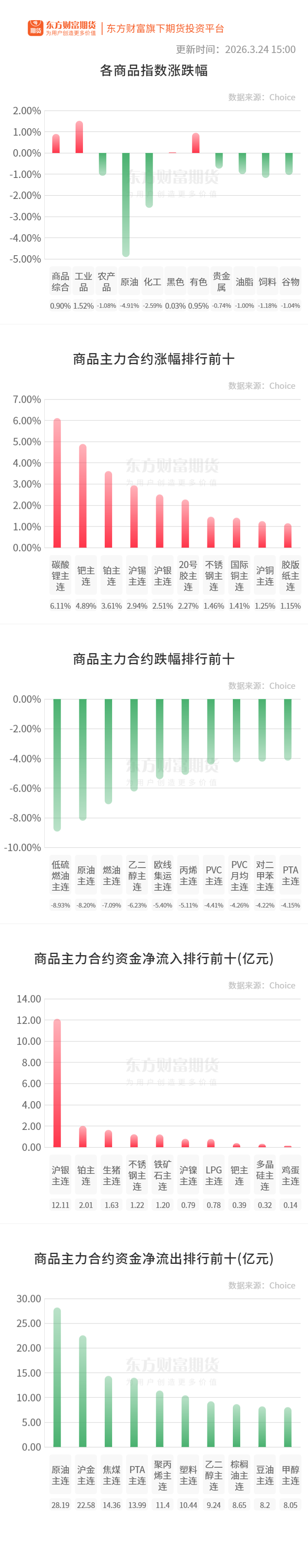黄金:3月24日,国内品牌金饰价格继续下行,多家知名金饰品牌报价已跌至今年年初水平。其中,周大福金饰报价为1346元/克,较今年1月1日的1357元/克下跌11元;周生生金饰报价1350元/克,比1月2日1360元/克的报价低10元。(界面新闻)