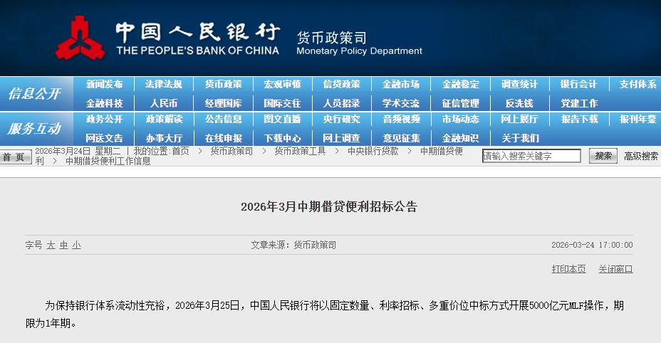 3月24日,中国人民银行公布的3月中期借贷便利招标公告显示,为保持银行体系流动性充裕,2026年3月25日,将以固定数量、利率招标、多重价位中标方式开展5000亿元MLF操作,期限为1年期。