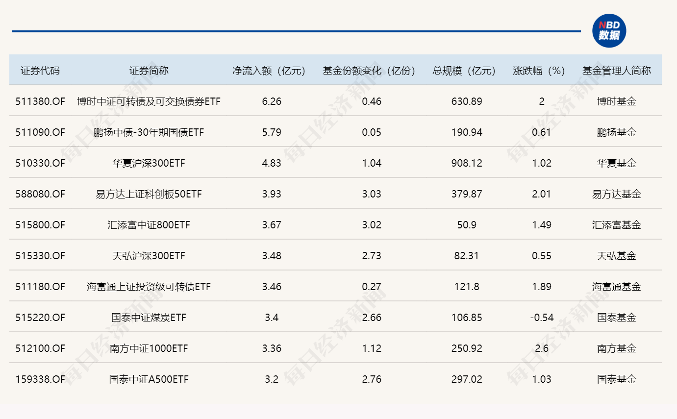 Wind数据显示,在3月24日的非货币ETF市场中,博时中证可转债及可交换债券ETF基金份额增加0.46亿份,净流入额6.26亿元;鹏扬中债-30年期国债ETF基金份额增加0.05亿份,净流入额5.79亿元;华夏沪深300ETF基金份额增加1.04亿份,净流入额4.83亿元。