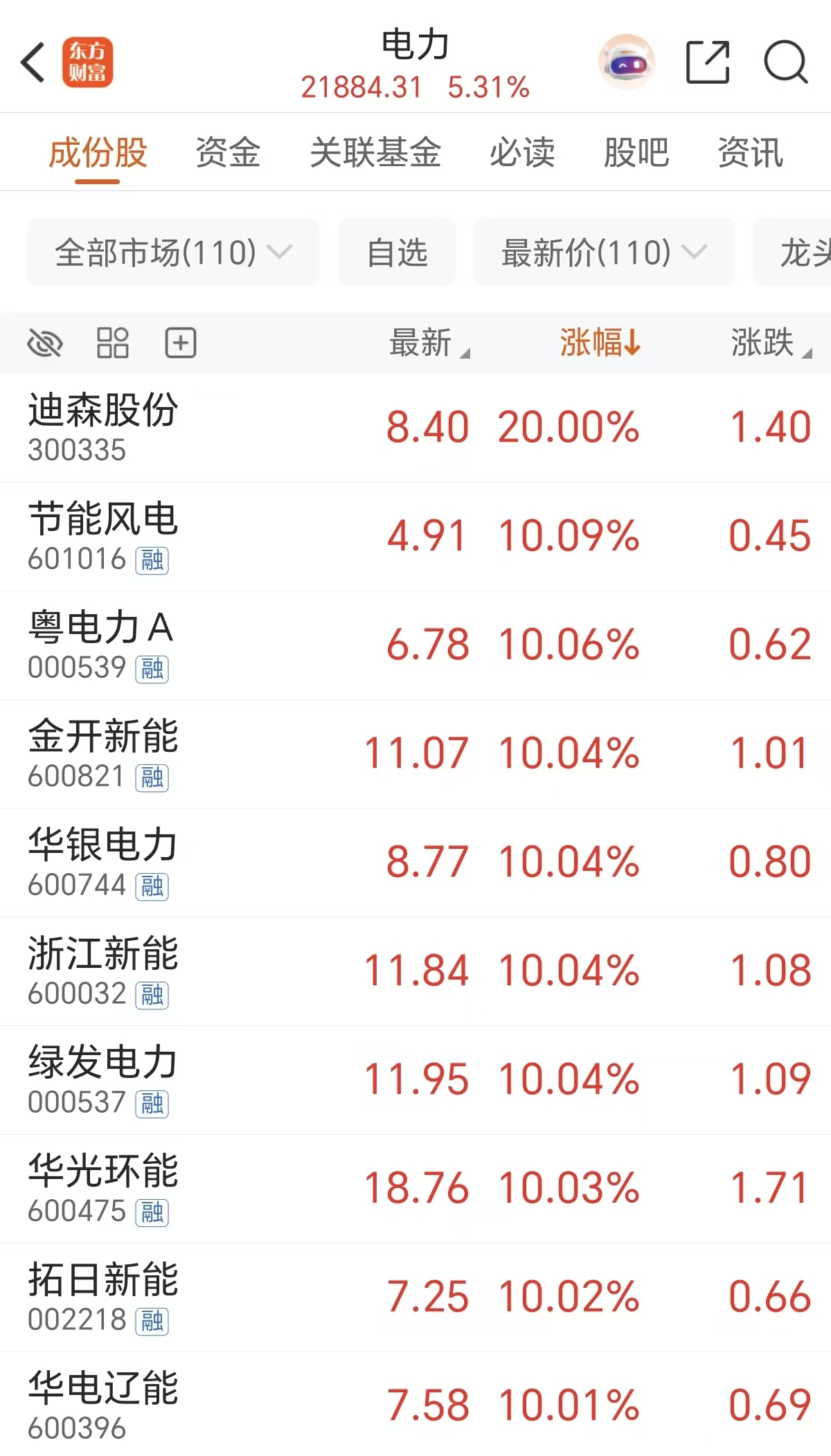 周二(3月24日)电力概念大幅走强,迪森股份20CM涨停,节能风电、粤电力A、华银电力等多股涨停。