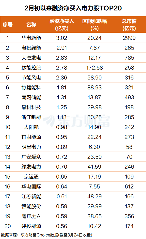 东方财富Choice数据显示,自今年2月初以来,杠杆资金净买入了一批电力股,华电新能位列第一,融资净买入超3亿元;电投绿能位列第二,融资净买入超2.9亿元。