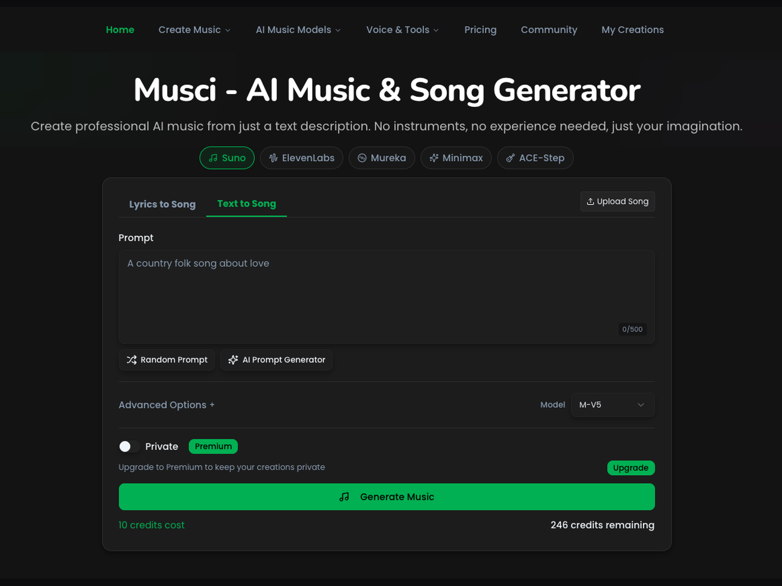 最近在找 AI 音乐生成工具的时候,偶然发现了 musci.io 这个平台,用了一段时间后觉得很适合分享给独立开发者们。