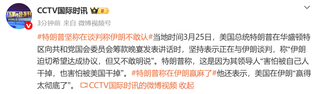 据CCTV国际时讯,当地时间3月25日,美国总统特朗普在华盛顿特区向共和党国会委员会筹款晚宴发表讲话时,坚持表示正在与伊朗谈判,称“伊朗迫切希望达成协议,但又不敢明说”。特朗普称,这是因为其领导人“害怕被自己人干掉,也害怕被美国干掉”。他还表示,美国在伊朗“赢得太彻底了”。