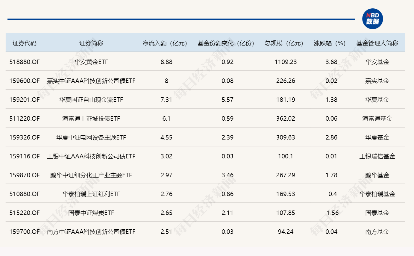 Wind数据显示,在3月25日的非货币ETF市场中,华安黄金ETF基金份额增加0.92亿份,净流入额8.88亿元;嘉实中证AAA科技创新公司债ETF基金份额增加0.08亿份,净流入额8.00亿元;华夏国证自由现金流ETF基金份额增加5.57亿份,净流入额7.31亿元。