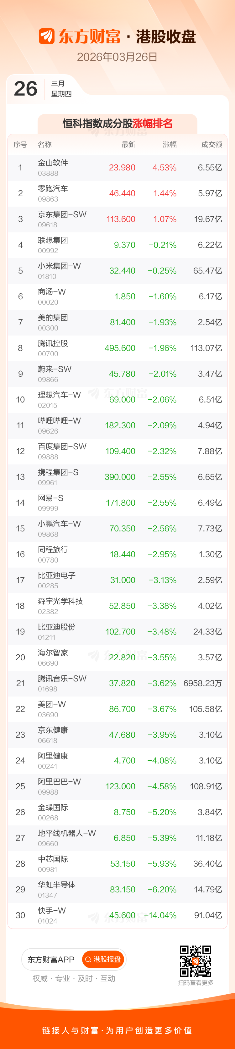 港股3月26日收盘走低,恒生指数收报24856.43点,跌479.52点,跌幅1.89%;恒生科技指数收报4761.54点,跌161.4点,跌幅3.28%。恒生指数成分股中蒙牛乳业、中国海洋石油、中国石油股份涨幅居前,快手-W、泡泡玛特、中国人寿跌幅靠前。恒生科技指数成分股中金山软件、零跑汽车、京东集团-SW涨幅居前,快手-W、华虹半导体、中芯国际跌幅靠前。