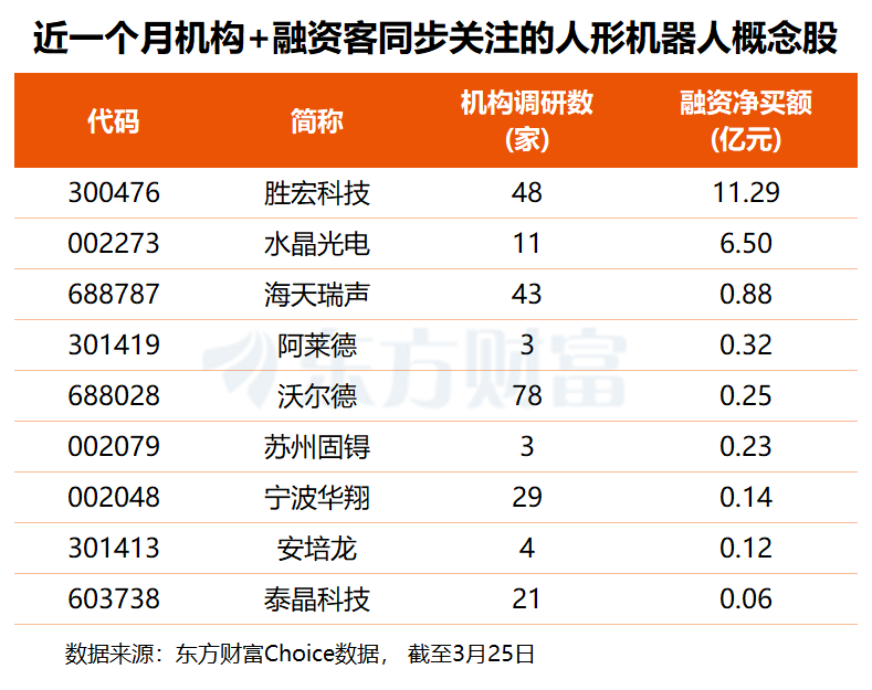 东方财富Choice数据显示,近一个月来,共有9只人形机器人概念股获得机构调研,同时还获得杠杆资金加仓。其中,胜宏科技获融资客大举抢筹超11亿元,水晶光电融资净买额约6.5亿元,海天瑞声获融资净买入0.88亿元,阿莱德、沃尔德、宁波华翔等5股均获杠杆资金超千万元加仓。