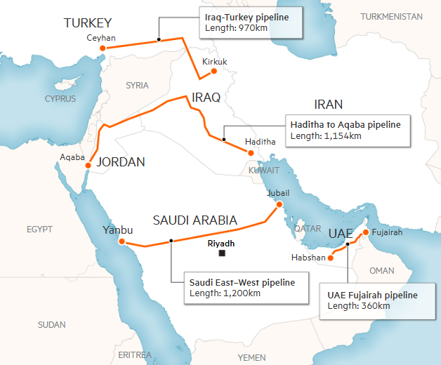 当前的冲突凸显了沙特阿拉伯全长1200公里的“东西管道”的战略价值。该管道建于20世纪80年代,当时由于担心伊朗与伊拉克的战争会封锁海峡而兴建。而现在,它已成为了沙特石油出口的一条关键生命线——该国目前每天能通过该管道向红海港口延布输送700万桶石油,完全绕过霍尔木兹海峡。