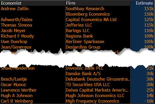 目前,华尔街机构对今晚数据的预估整体分歧较大——最乐观的预计3月非农就业人数将增长15万人,而最悲观的则预计将减少1.5万人,连续第二个月出现“负非农”。