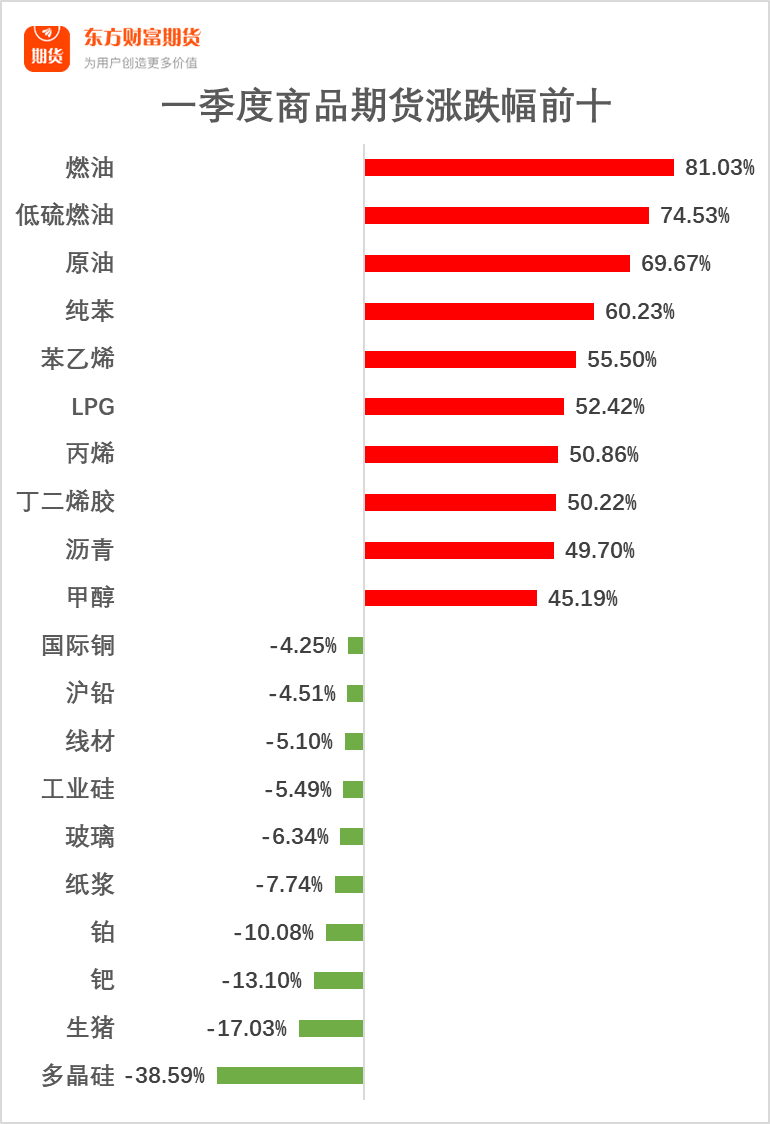 经统计,一季度能源化工品种表现强势,包揽涨幅前十席位,且涨幅均突破40%,分别为燃油(81.03%)、低硫燃油(74.53%)、原油(69.67%)、纯苯(60.23%)、苯乙烯(55.50%)、LPG(52.42%)、丙烯(50.86%)、丁二烯胶(50.22%)、沥青(49.70%)和甲醇(45.19%)。