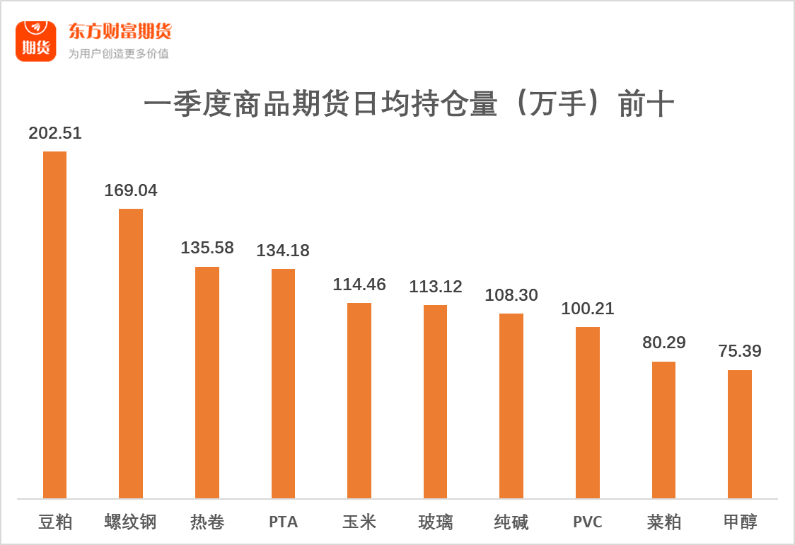 一季度商品期货日均持仓量前十中,各品种持仓规模呈现梯度分布。日均持仓量突破200万手的品种仅有豆粕(202.51万手);日均持仓量在100万到200万手之间的品种有螺纹钢(169.04万手)、热卷(135.58万手)、PTA(134.18万手)、玉米(114.46万手)、玻璃(113.12万手)、纯碱(108.30万手)和PVC(100.21万手);日均持仓量低于100万手的品种有菜粕(80.29万手)和甲醇(75.39万手)。