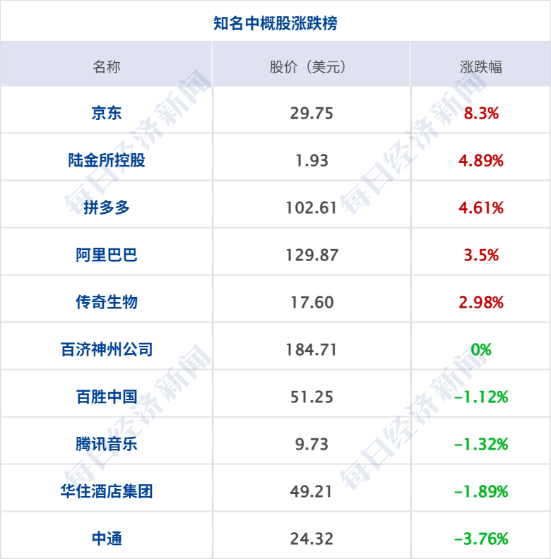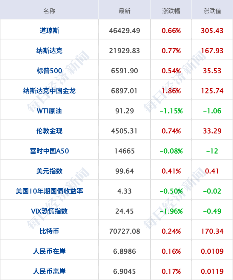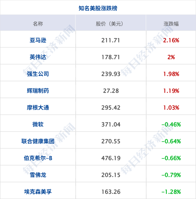 美股三大指数集体收涨,道琼斯指数涨0.66%,标普500指数涨0.54%,纳斯达克综合指数涨0.77%;科技股走高,AMD、英特尔涨超7%,亚马逊涨超2%,英伟达涨2%,奈飞、高通涨超1%;存储概念股下挫,美光科技、闪迪跌超3%,希捷科技跌超2%,西部数据跌1.6%。中概股普涨,纳斯达克中国金龙指数涨1.85%,京东涨超8%,拼多多、爱奇艺涨超4%,阿里巴巴涨超3%,百度涨超2%,理想汽车、哔哩哔哩涨超1%。