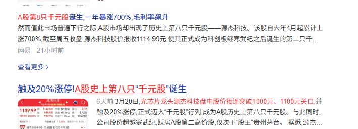 更引人注目的是,就在几天前的3月20日,源杰科技股价成功突破1000元,创下该股历史新高,并成为A股历史上第8只千元股、A股当前第二高价股。
