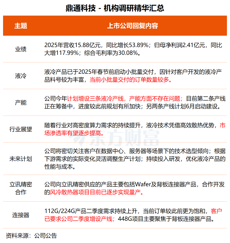 鼎通科技:液冷产品已小批量交付 今年将新增三条产线