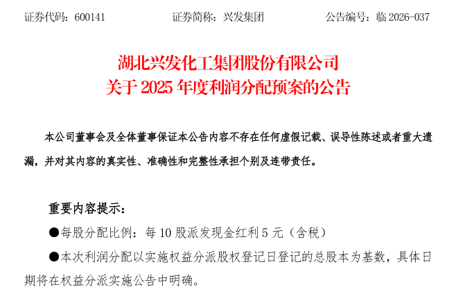 兴发集团(600141)公告,公司拟向全体股东每10股派发现金红利5元(含税),预计派发现金红利5.98亿元(含税),占2025年度归属于上市公司股东的净利润比率为40.08%。