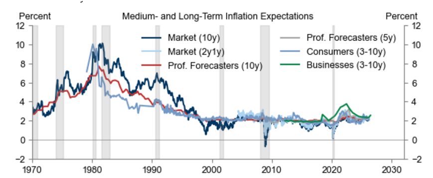 其次,当前经济开局态势,决定通胀大概率不会出现显著的第二轮传导效应。目前中长期通胀预期已牢牢稳住,与上世纪70年代的情况截然不同。2021至2022年期间,通胀预期也始终保持稳定,这也是美联储公开市场委员会无需像上世纪80年代那样,通过引发经济衰退来压低通胀的原因之一。