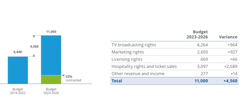 根据FIFA在年度报告中披露的2023年—2026年周期预算,相关授权商品的商业等收入约110亿美元,其中转播权收入约42.64亿美元,门票及款待收入约30.97亿美元,商业赞助收入约26.93亿美元,授权(licensing)收入约6.69亿美元。尽管授权收入体量相对有限,仅占约6%,但显然会被进一步强化。