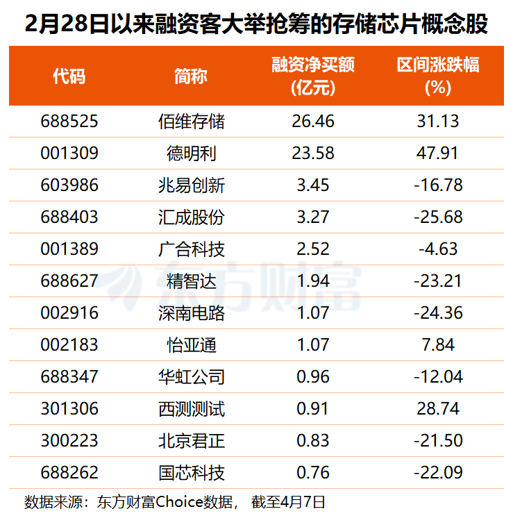 从资金角度看,2月28日以来,共有28只存储芯片概念股获得融资净买入,佰维存储、德明利均获杠杆资金大幅加仓超20亿元,兆易创新、汇成股份亦获融资客抢筹超3亿元,广合科技、精智达、深南电路、怡亚通融资净买额均在1亿元以上。