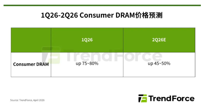 根据TrendForce集邦咨询最新存储器产业研究,大厂逐步退出成熟DDR4以下产品制造的策略不变,在市场供给结构持续收敛下,过去几个月整体价格已累积惊人涨幅。TrendForce集邦咨询考量供给持续缩减、订单转移,以及成熟制程供应商产能扩张不及等因素,预估2026年第二季ConsumerDRAM合约价格仍将持续季增45-50%。