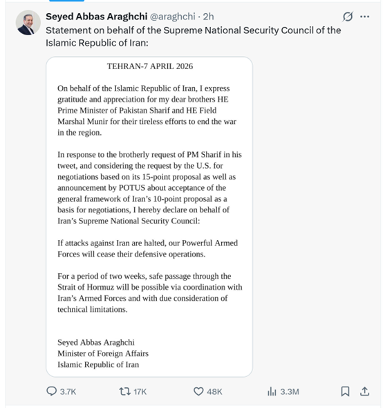 在阿拉格奇发表此番言论之际,美国总统特朗普当地时间周二晚间表示,同意在两周内暂停对伊朗的轰炸和袭击。伊朗方面也发表声明称,接受巴基斯坦提出的停火提议。
