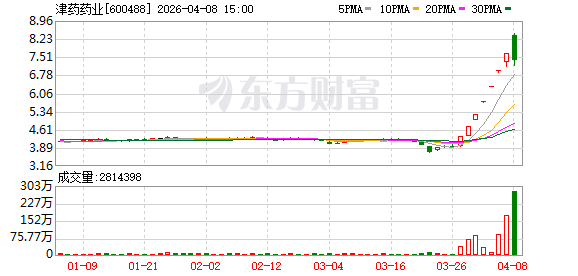 其中津药药业的股价异动尤为引发市场关注。该股连续10个交易日内(3月24日至4月7日)日收盘价格涨幅偏离值累计达到100%,3月26日至4月7日期间,公司股票连续七个交易日涨停,期间股票价格累计涨幅93.69%。截至4月7日收盘,每股报价7.67元,市值约83.75亿元。