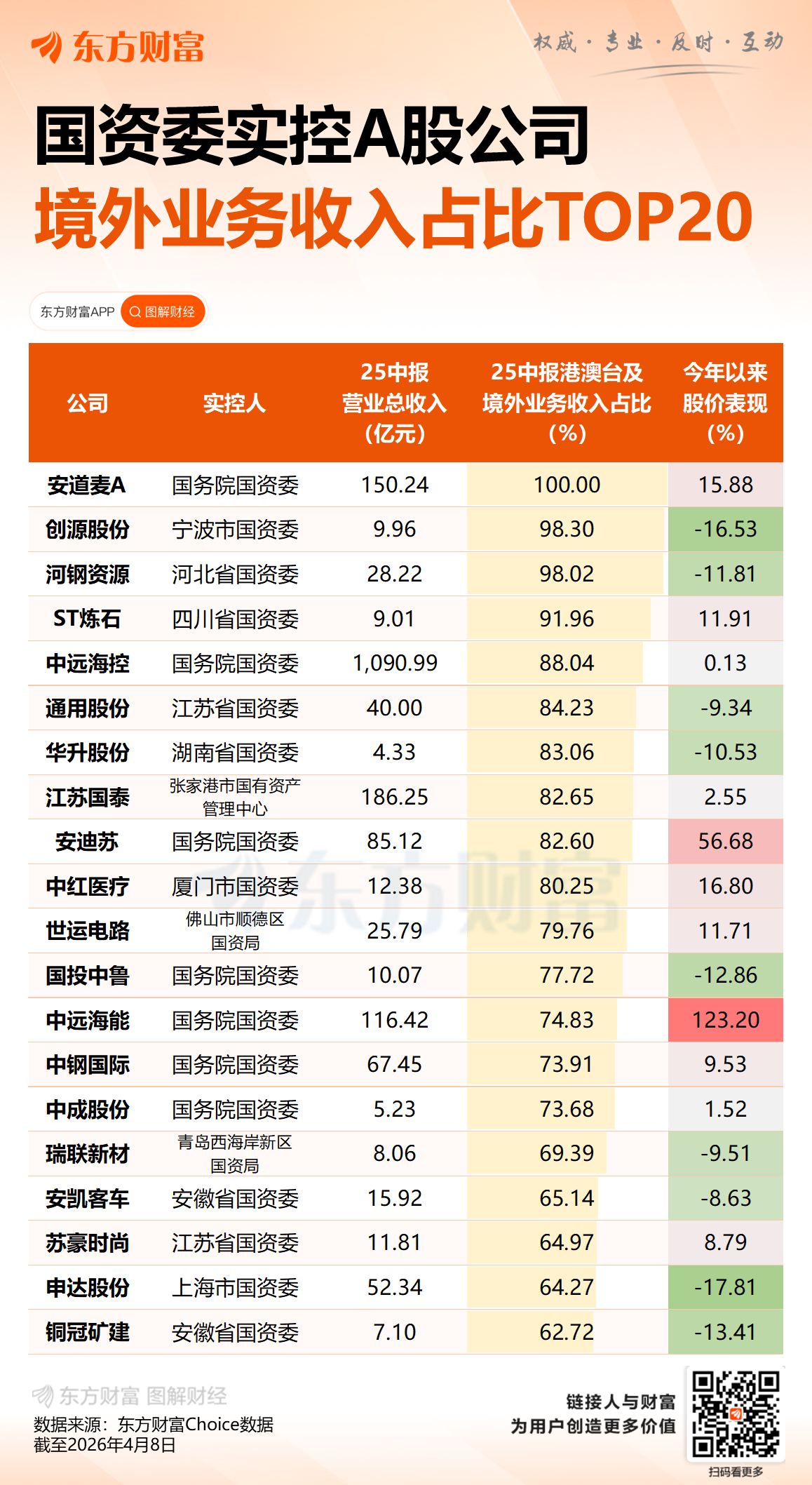 国务院国资委4月8日公布,国务院国资委成立境外国资工作局。据介绍,境外国资工作局主要职责是指导所监管企业国际化经营和境外资产布局优化、结构调整,承担所监管企业境外资产监督有关工作,加强境外投资经营等方面风险防范化解,承担境外突发事件和危机处理有关工作。