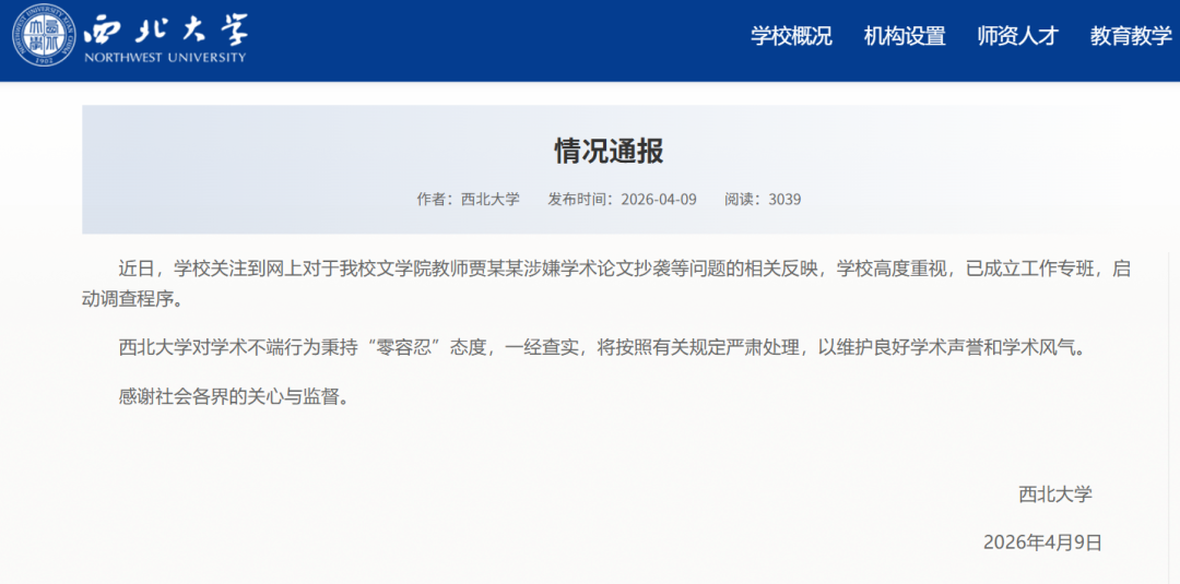 近日,学校关注到网上对于我校文学院教师贾某某涉嫌学术论文抄袭等问题的相关反映,学校高度重视,已成立工作专班,启动调查程序。