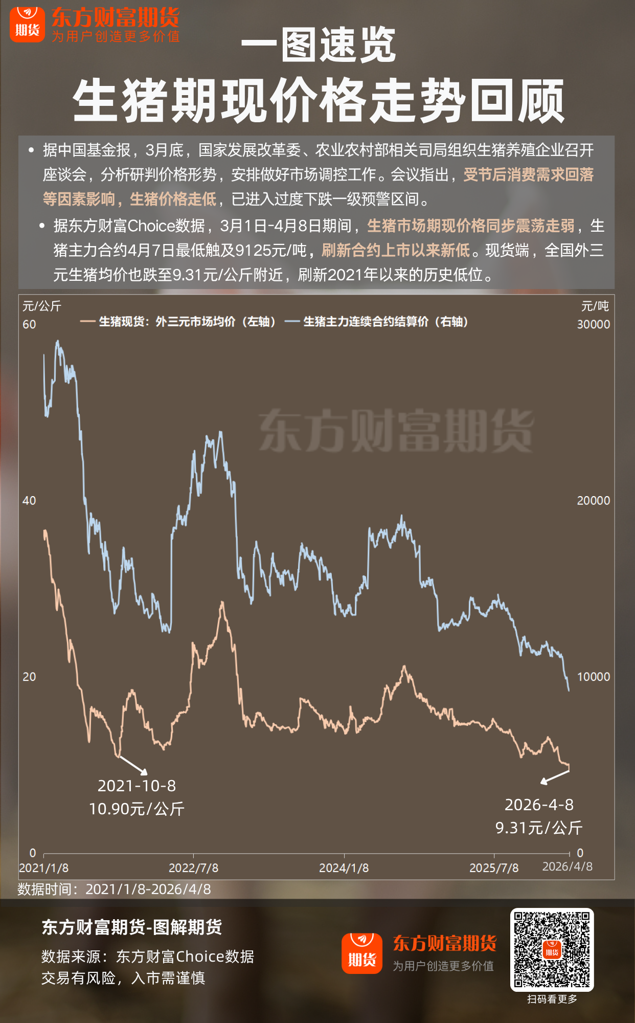 Home期货图解期货 | 生猪期现价格走势回顾 期货 2026 年 4 月 9 日 图解期货 | 生猪期现价格走势回顾 By 古方信息网 - Advertisement - 据中国基金报,3月底,国家发展改革委、农业农村部相关司局组织生猪养殖企业召开座谈会,分析研判价格形势,安排做好市场调控工作。会议指出,受节后消费需求回落等因素影响,生猪价格走低,已进入过度下跌一级预警区间。一图速览生猪期现价格走势回顾。 (东方财富研究中心) 文章转载自 东方财富 - Advertisement - Must Read 贵金属 反弹还是诱多?黄金周四惨烈下跌后出现技术回升 古方信息网 - 2026 年 4 月 9 日 - Advertisement - 基金 资金抢筹布局“十五五”军工发展机遇,军工ETF国泰(512660)近5日净流入超1.6亿元 2026 年 4 月 9 日 24小时 特朗普称美伊预计“很快举行”面对面会谈 2026 年 4 月 9 日 股票 A股四大指数下跌,算力硬件股逆势走强,医药、贵金属、旅游酒店板块下跌 | A股早盘 2026 年 4 月 9 日 Related News 贵金属 反弹还是诱多?黄金周四惨烈下跌后出现技术回升 2026 年 4 月 9 日 基金 资金抢筹布局“十五五”军工发展机遇,军工ETF国泰(512660)近5日净流入超1.6亿元 2026 年 4 月 9 日 24小时 特朗普称美伊预计“很快举行”面对面会谈 2026 年 4 月 9 日 股票 A股四大指数下跌,算力硬件股逆势走强,医药、贵金属、旅游酒店板块下跌 | A股早盘 2026 年 4 月 9 日 期货 商务部回应稀土出口管制:中美将通过经贸磋商机制保持沟通 2026 年 4 月 9 日 - Advertisement -