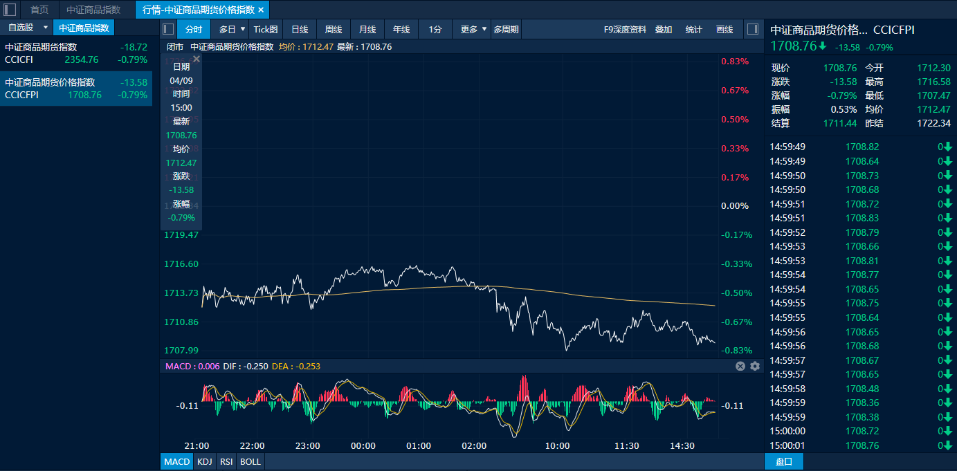 截至9日下午收盘,中证商品期货价格指数收报1708.76点,较前一交易日下跌13.58点,跌幅0.79%;中证商品期货指数收报2354.76点,较前一交易日下跌18.72点,跌幅0.79%。