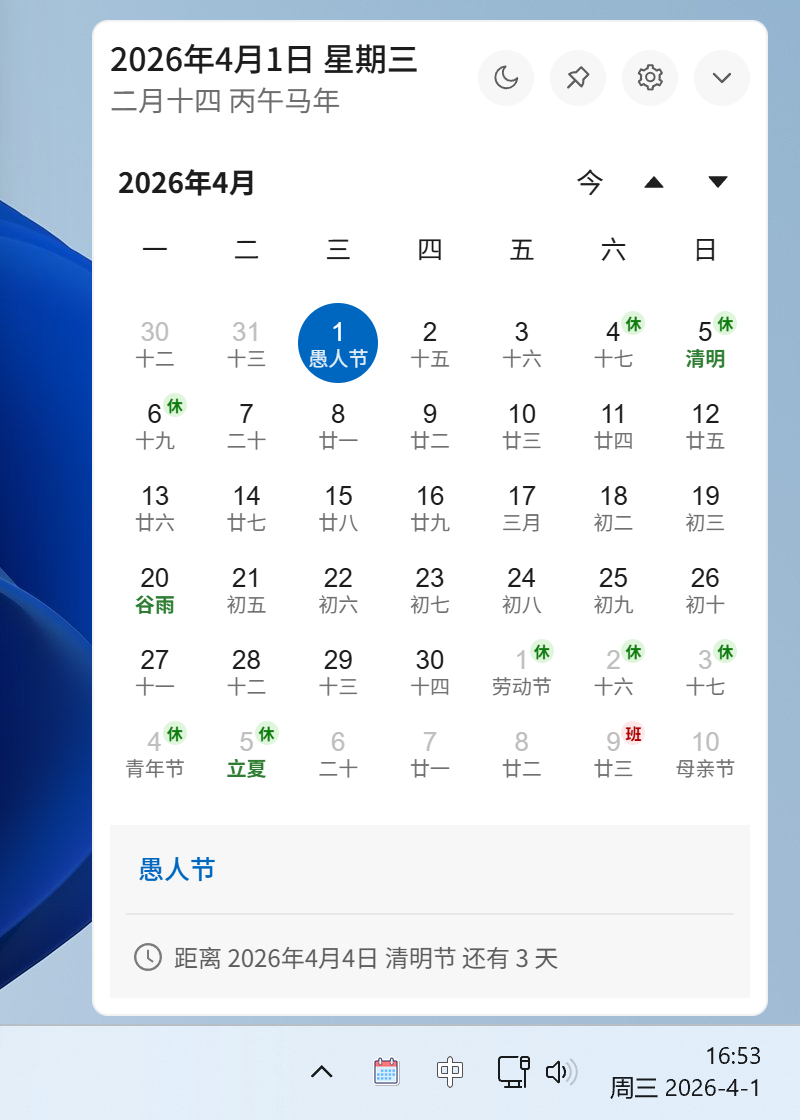 Home科技 松鼠日历 - 跨平台的桌面日历,支持显示农历、节假日、调休、节气等信息 科技 2026 年 4 月 10 日 [开源] 松鼠日历 – 跨平台的桌面日历,支持显示农历、节假日、调休、节气等信息 By 古方信息网 - Advertisement - 松鼠日历 跨平台的桌面日历,支持显示农历、节假日、调休、节气等信息 主要功能 支持 macOS、Windows 等操作系统 自定义 Windows 任务栏时钟,可显示星期等信息 替换 Windows 任务栏的系统日历 在 Windows 桌面上显示日历 下载 https://github.com/CrankZ/li-calendar 文章来源:w2solo - Advertisement - Must Read 期货 特朗普警告伊朗不要收霍尔木兹海峡通行费 伊朗最高领袖提出三点主张 古方信息网 - 2026 年 4 月 10 日 - Advertisement - 24小时 三部门指导平台企业落实《互联网平台价格行为规则》 2026 年 4 月 10 日 世界 缅因州拟暂停大型数据中心建设至2027年底 或成全美首例 2026 年 4 月 10 日 外汇 印度央行强制银行平仓卢比空头头寸 银行面临数亿美元潜在亏损 2026 年 4 月 10 日 Related News 期货 特朗普警告伊朗不要收霍尔木兹海峡通行费 伊朗最高领袖提出三点主张 2026 年 4 月 10 日 24小时 三部门指导平台企业落实《互联网平台价格行为规则》 2026 年 4 月 10 日 世界 缅因州拟暂停大型数据中心建设至2027年底 或成全美首例 2026 年 4 月 10 日 外汇 印度央行强制银行平仓卢比空头头寸 银行面临数亿美元潜在亏损 2026 年 4 月 10 日 股票 资金持续布局恒生科技!恒生科技ETF天弘(520920)昨日成交额超3亿元,近30个交易日“吸金”超21亿元 2026 年 4 月 10 日 - Advertisement -
