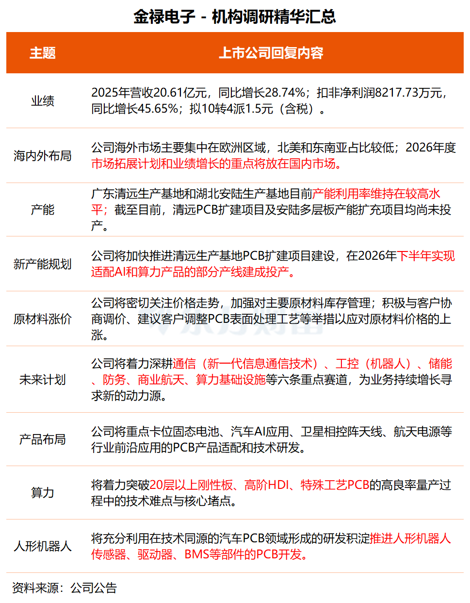 对于未来业务拓展计划,金禄电子表示,公司将加快产品技术薄弱环节的攻坚克难,着力突破20层以上刚性板、高阶HDI、特殊工艺PCB的高良率量产过程中的技术难点与核心堵点;充分利用在技术同源的汽车PCB领域形成的研发积淀推进人形机器人传感器、驱动器、BMS等部件的PCB开发;重点卡位固态电池、汽车AI应用、卫星相控阵天线、航天电源等行业前沿应用的PCB产品适配和技术研发。